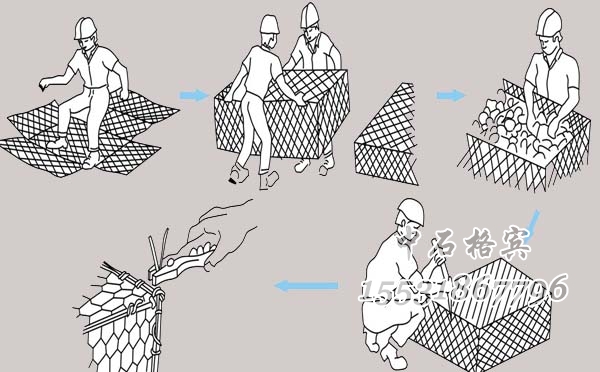 护坡防洪雷诺护垫在工地上通常随时可以安装,为了运输,雷诺护垫须折叠成平面,然后就把它放到适当位置上打开,再把大小适宜的石块装入笼中,把盖子系紧,再把各个雷诺护垫和相邻的铅丝笼绑起。
